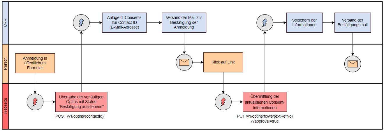 Beim Double OptIn legt die Webseite für einen aktuell nicht authentifizierten Kunden Consent-Datensätze mit dem Status “Bestätigung ausstehend” an. Im Falle, dass die E-Mail-Adresse im CRM nicht bekannt ist, können keine Consent-Datensätze angelegt werden.