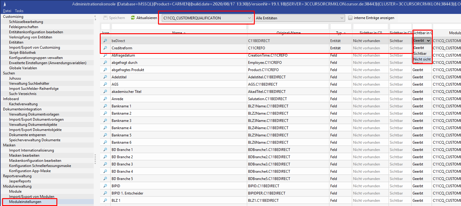 Mit Auslieferung des CQ-Moduls sind die Entitäten C11BEDIRECT, C11CREFO und C11DNB unabhängig vom Dienstgeberkontext als sichtbar konfiguriert. Dies ist notwendig, da bspw. aus dem Untermodul CQ Creditreform auf die Entität C11BEDIRECT zugegriffen wird. Sofern nicht alle Dienstgeber-Module zum Einsatz kommen, kann die jeweilig nicht relevante Entität ausgeblendet werden.