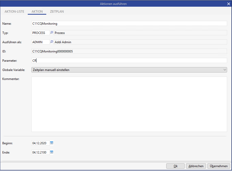 Kommen mehrere Dienstgebermodule paralell zum Einsatz und sollen Monitoringprozesse automatisiert ausgeführt werden, so muss der Prozess C11CQMONITORING in der C2-Schicht kopiert, unter einem anderen Namen gespeichert und via Timer separat konfiguriert werden.