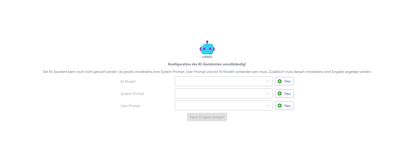 Jeder Anwender mit Basis-Administrationsrechten (open.admin.console.permission) kann die Konfiguration vornehmen. Für die Konfiguration einer Eingabe muss mindestens ein KI-Modell, ein System-Prompt und ein User-Prompt angelegt sein. Aus diesem Grund wurde ein Initial-Assistenten eingeführt, um durch die ersten notwendigen Konfigurationsschritte zu leiten.
