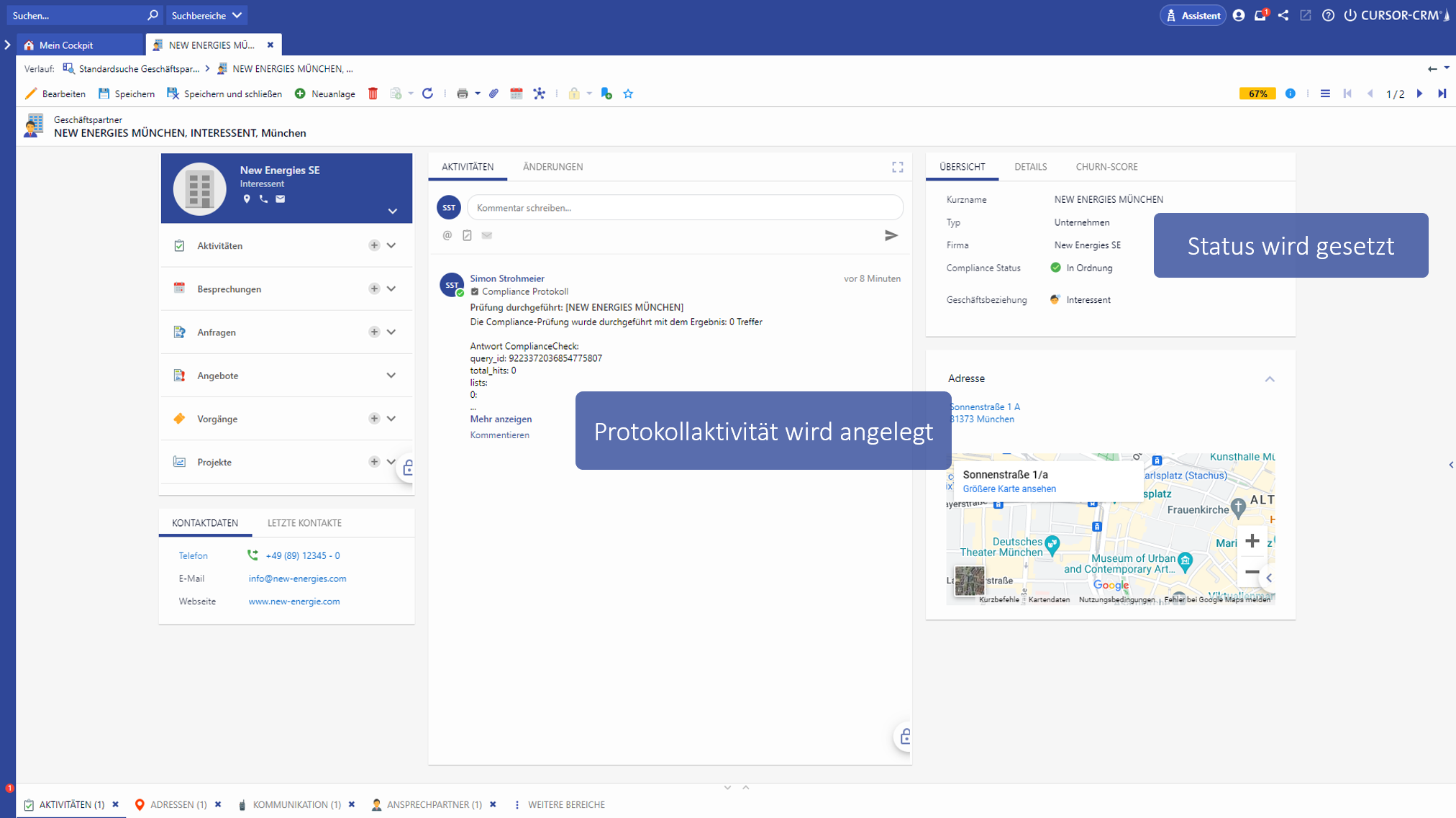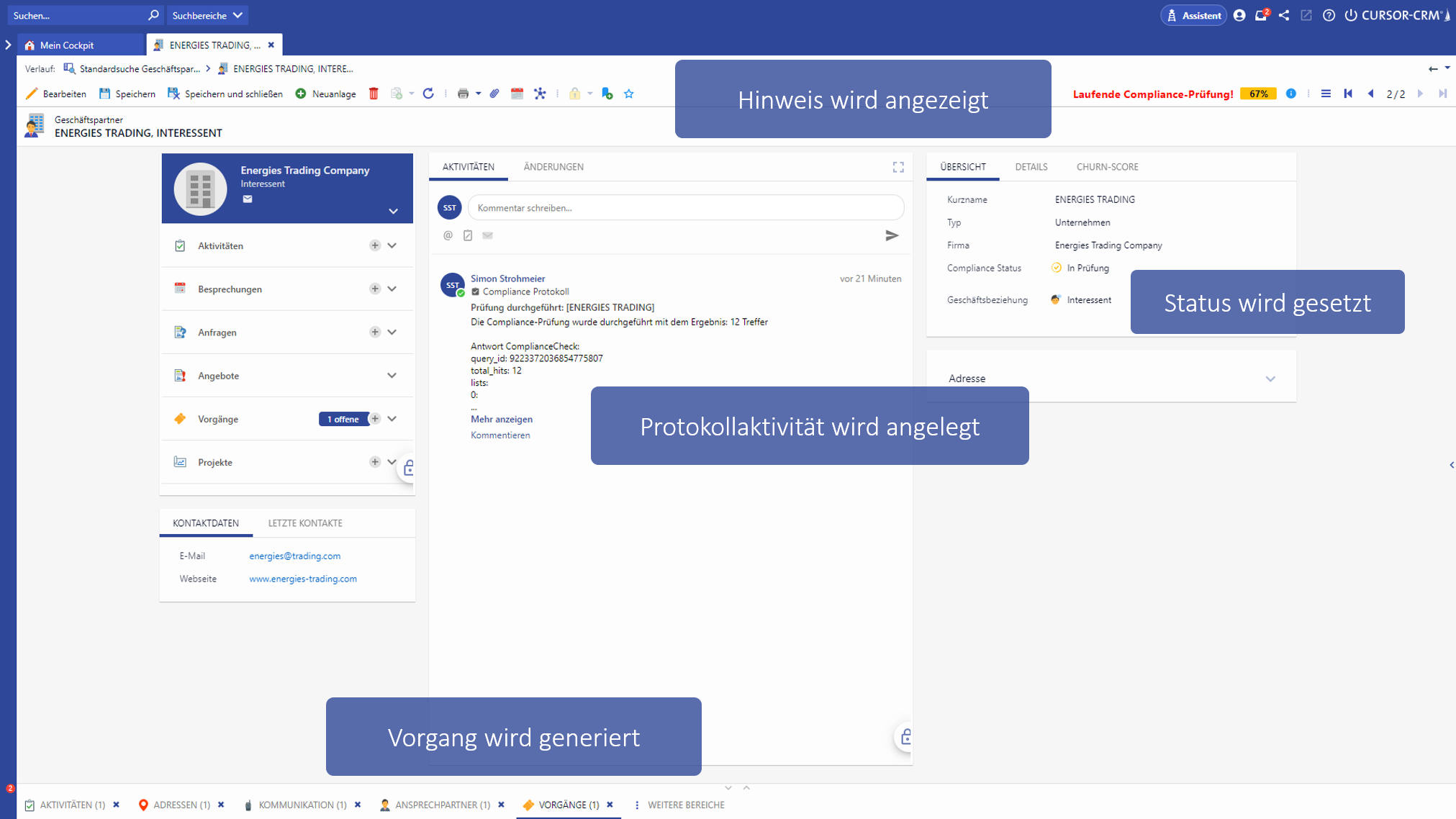 Das Ergebnis wird sowohl im Vorgang als beim betreffenden Geschäfts- bzw. Ansprechpartner als Protokollaktivität hinterlegt. Auch der Compliance-Status wird entsprechend von “In Prüfung” auf “In Ordnung” oder “Kritisch” aktualisiert (je nach Prüfungsergebnis).