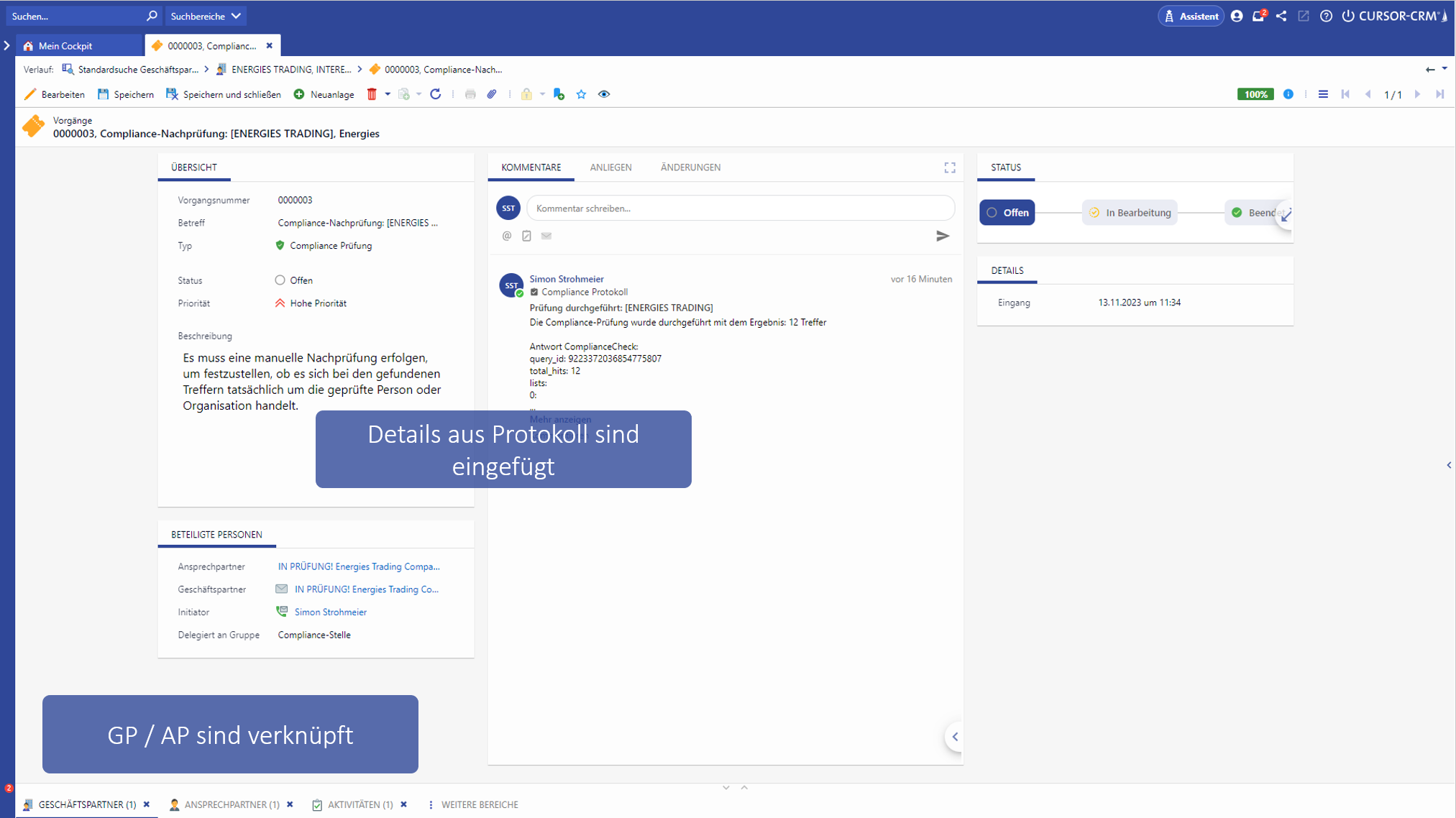 Im Vorgang kann die Compliance-Gruppe sehen, um welchen Geschäfts- oder Ansprechpartner es sich handelt, da dieser automatisch mit dem Vorgang verknüpft wurde. Außerdem ist das Prüfungsprotokoll hinterlegt, sodass nachvollziehbar ist, welche Treffer zur Nachprüfung geführt haben.