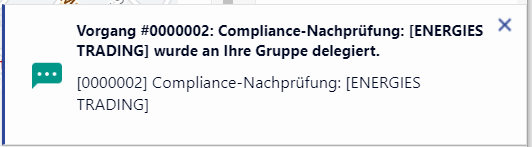 Diese Nachprüfung erfolgt innerhalb eines Vorgangs, der automatisch angelegt wird, sobald mindestens ein Treffer bei der Prüfung durch den Compliance-Service gefunden wird. Die Anwender in der Compliance-Gruppe erhalten bei der Anlage des Vorgangs eine Benachrichtigung im CRM.