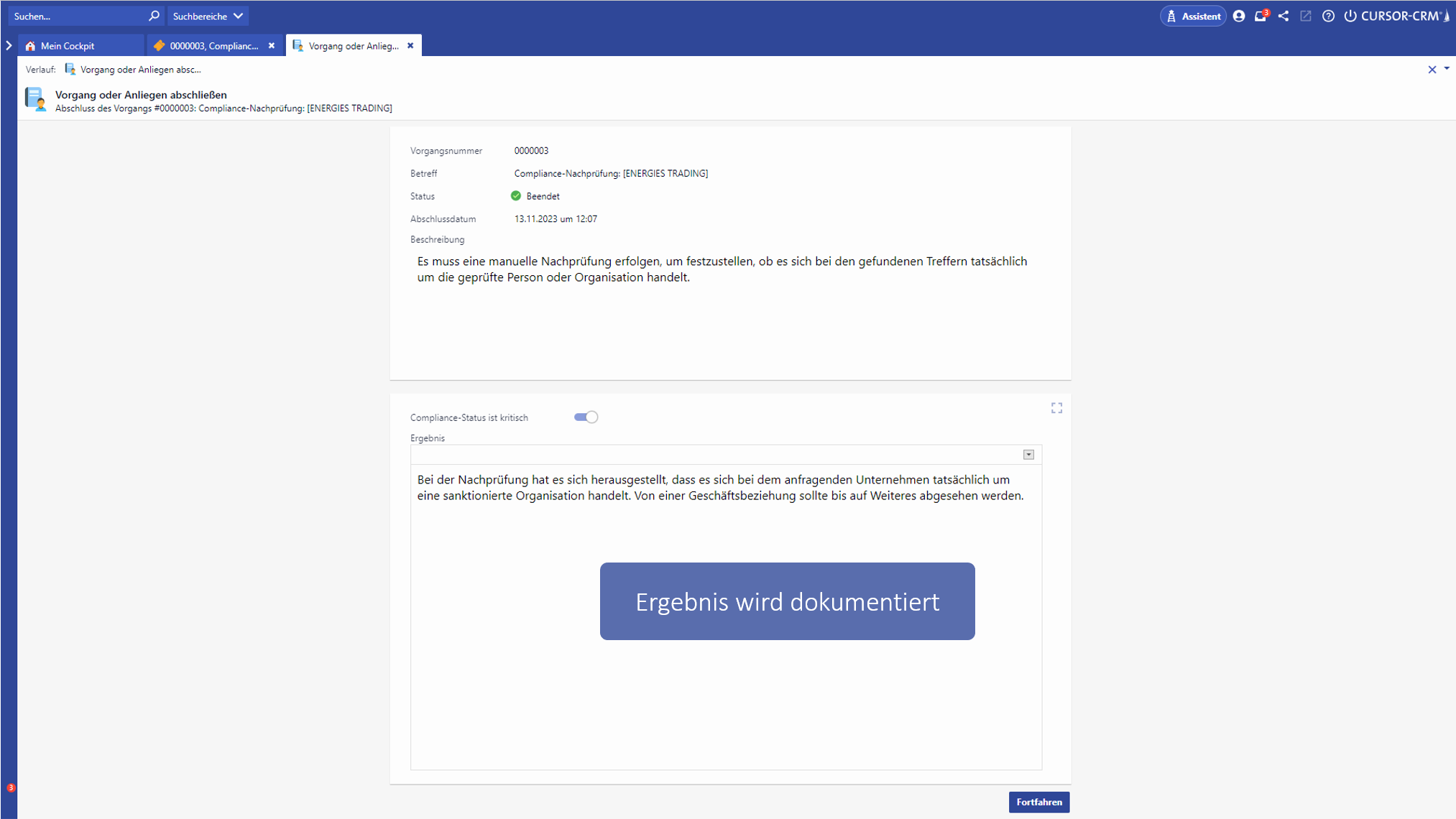 Konnte der Anwender mithilfe der eingeholten Informationen feststellen, ob es sich tatsächlich um eine Organisation oder eine Person auf einer Sanktionsliste handelt, kann er auch im CRM den Prüfungsvorgang abschließen. Hierfür sollte der in der Aktionsbox vorhandene Prozess “Vorgang abschließen” genutzt werden. Darin kann der Anwender den Compliance-Status festlegen und das Prüfungsergebnis zusammengefasst protokollieren.