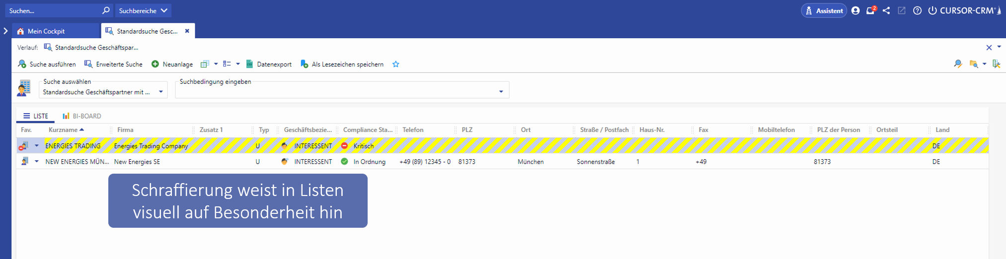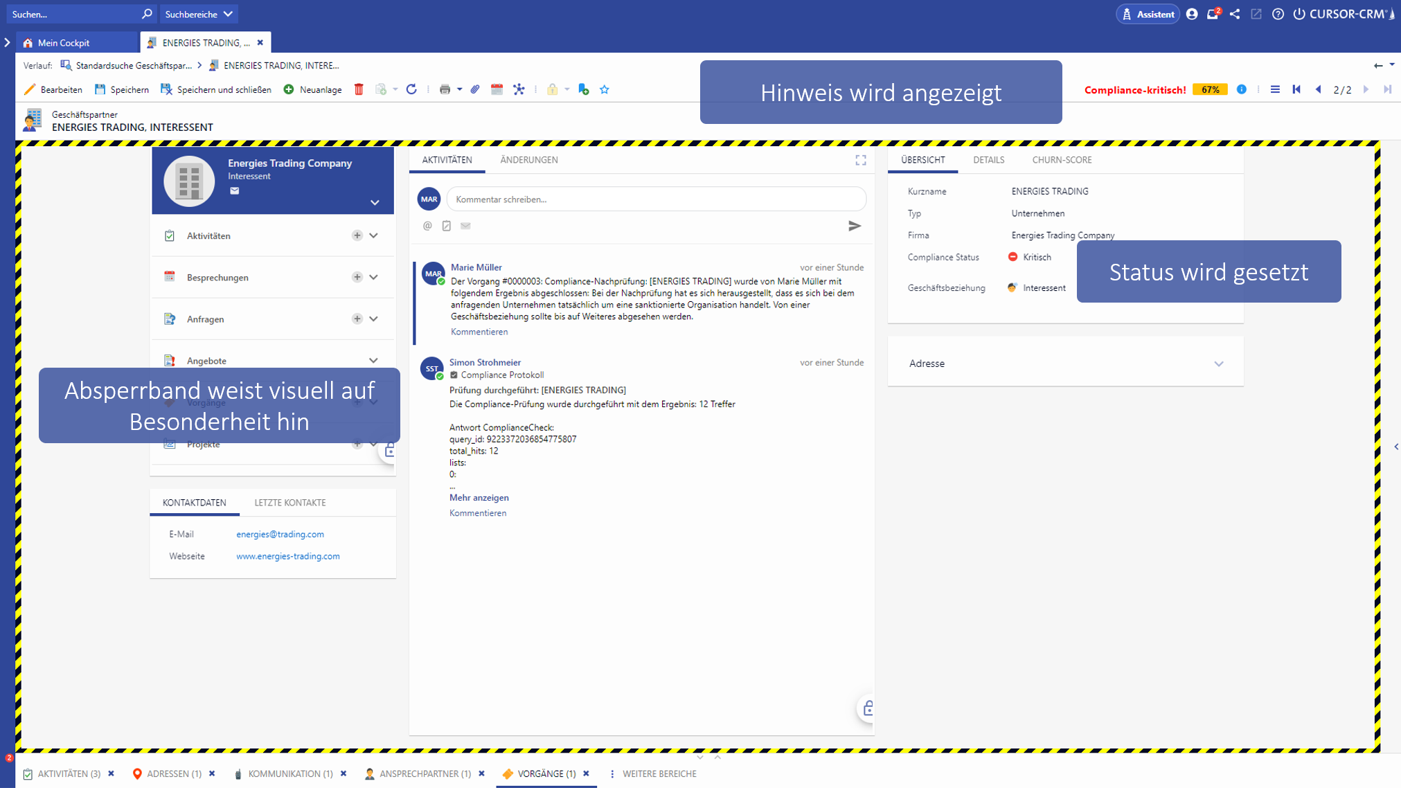 Handelt es sich um eine Compliance-kritische Person oder Organisation, wird dies neben dem entsprechenden Setzen des Compliance-Status entsprechend visualisiert, damit andere Anwender sofort gewarnt sind.