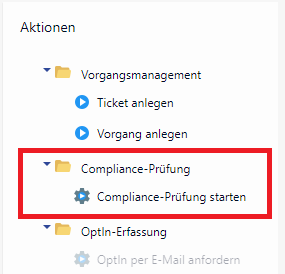 Hierfür gibt es in der Aktionsbox des Geschäfts- und Ansprechpartners einen Ordner "Compliance-Prüfung", der den Prozess "Compliance-Prüfung starten" enthält. Vor der Ausführung der Prüfung erfolgt eine Abfrage an den Anwender, ob eine manuelle Compliance-Prüfung tatsächlich durchgeführt werden soll, um eine versehentliche Abfrage zu verhindern. Wird die Abfrage mit “Ja” bestätigt, erfolgt die Prüfung im Hintergrund. Wird sie verneint, wird naturgemäß keine Prüfung durchgeführt.