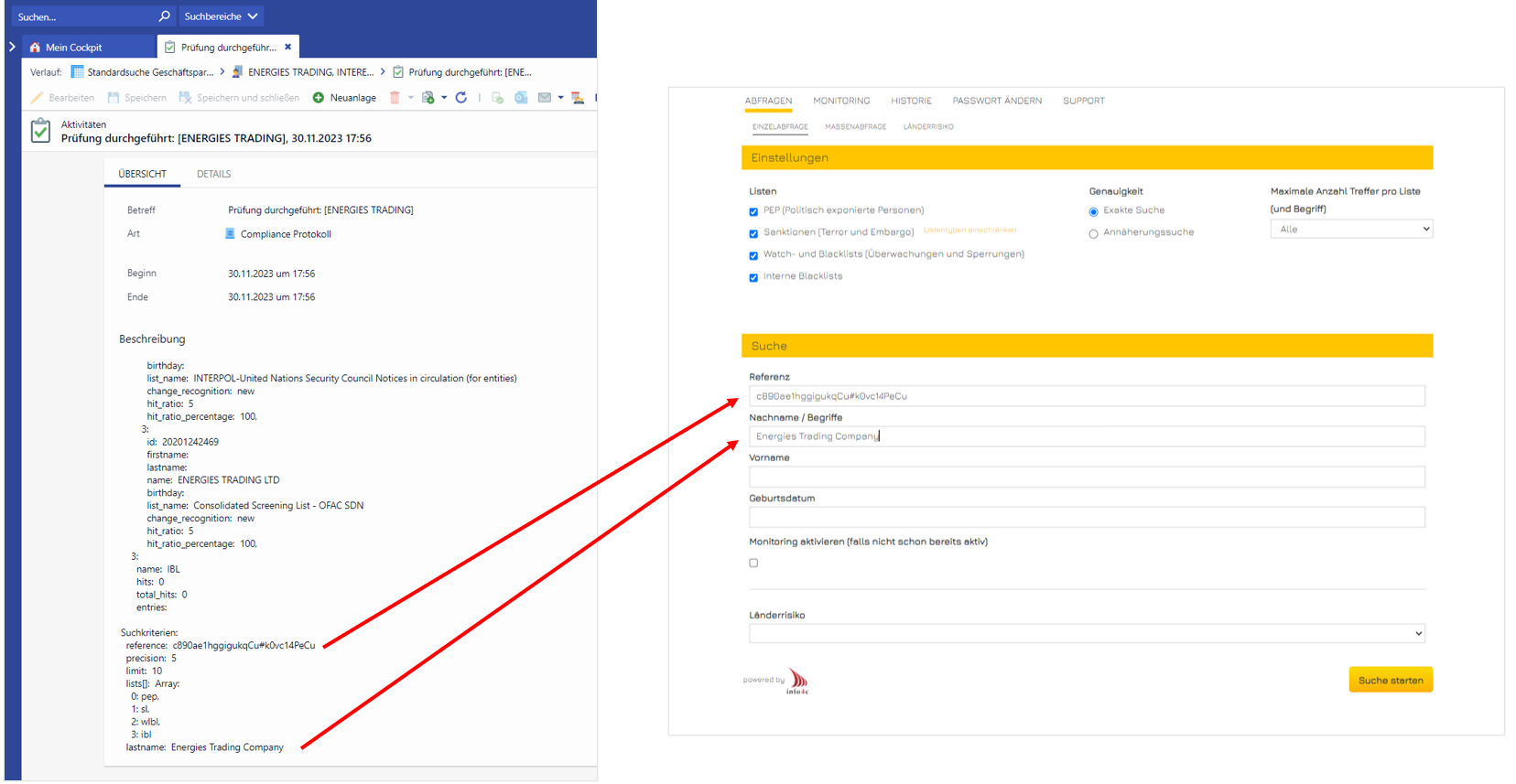 Der Compliance-Service gleicht nach dem Auslösen des Prüfungsprozesses im Hintergrund die eingegebenen Suchkriterien mit Einträgen auf den zu prüfenden Listen ab.