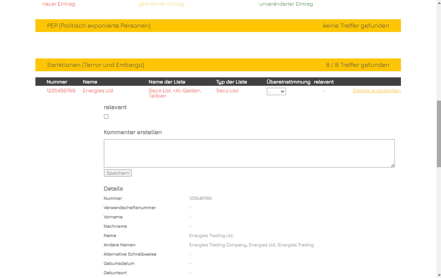 Fall A: Werden nun keine Treffer gefunden (weil z.B. ein vormals sanktioniertes Land nun wieder freigegeben wurde), wird der Compliance-Status auf “In Ordnung” gesetzt und die Prüfung entsprechend dokumentiert.