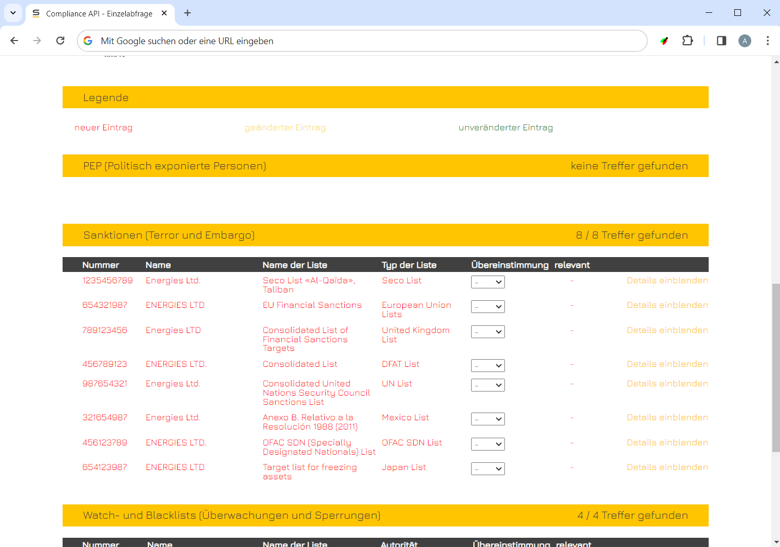 Beispielhaftes Suchergebnis der Compliance-Prüfung