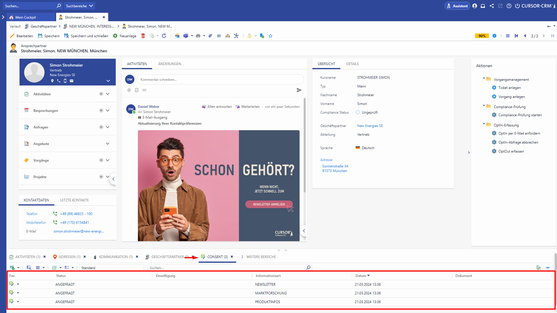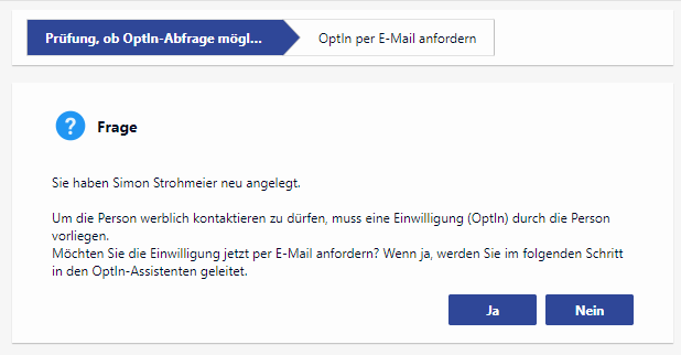 Neben der Einholung von OptIns bei der Neuanlage von Geschäfts- oder Ansprechpartnern gibt es die Möglichkeit, auch bei bereits angelegten natürlichen Personen gezielt Zustimmungen für Werbemaßnahmen einzuholen.