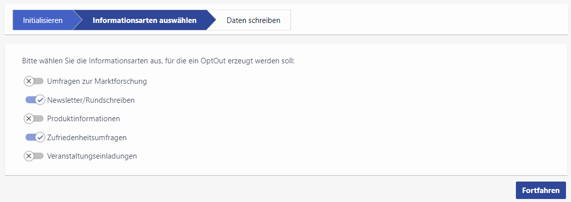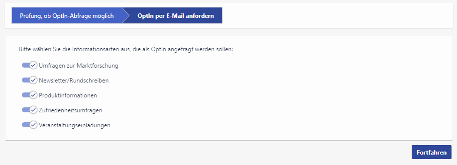 Bei einer Verneinung der Abfrage wird der OptIn-Prozess nicht gestartet. Bei einer Bestätigung wird der OptIn-Prozess gestartet und der Anwender erhält eine Auswahl der Informationsarten (z.B. Newsletter, Veranstaltungseinladungen), die angefragt werden können. Besteht bereits ein Consent-Datensatz zu einer Informationsart, steht diese Informationsart in der Auswahl nicht mehr zur Verfügung.