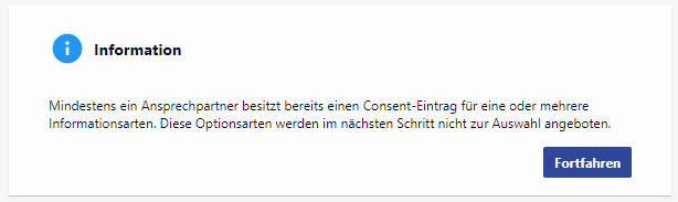 Besteht bereits bei einem oder mehreren Geschäfts- bzw. Ansprechpartnern ein Consent-Datensatz zu einer Informationsart, steht diese Informationsart in der Auswahl nicht mehr zur Verfügung. Bei der Mehrfachauswahl wird somit nur die Schnittmenge der Informationsarten angeboten, zu denen bei allen ausgewählten Geschäfts-/Ansprechpartnern noch kein Consent-Datensatz besteht. Eine entsprechende Meldung weist beim Start des Prozesses den Anwender auf diesen Umstand hin.