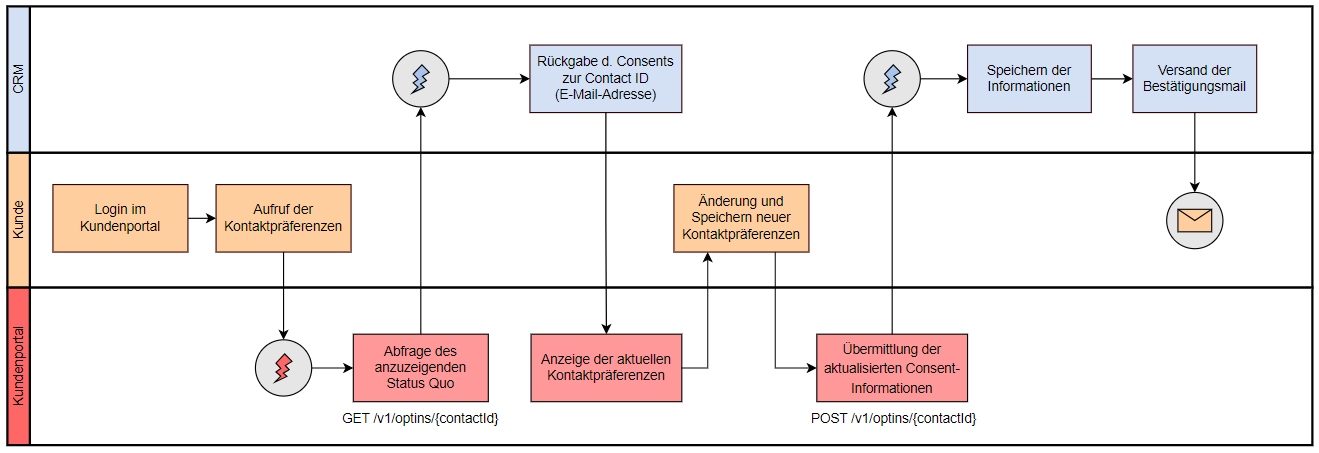 Hierbei fragt das Kundenportal beim Aufruf der Kontaktpräferenzen die aktuellen Consent-Informationen der betreffenden Person aus dem CRM ab, um diese darstellen zu können. Sobald die Änderungen der Kontaktpräferenzen gespeichert wurden, kann das Kundenportal die neuen Informationen an das CRM übertragen. Im CRM werden im Anschluss die Informationen verarbeitet und Folgeprozesse ausgelöst.