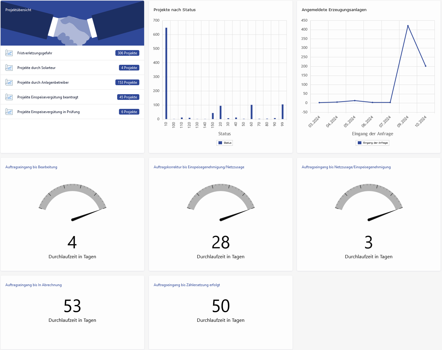 Eine Gesamtsicht auf die Projekte aller Projektgruppen, deren Durchlaufzeiten und Status bietet das Infoboard “Controlling Eigenerzeugungsanlagen”.
