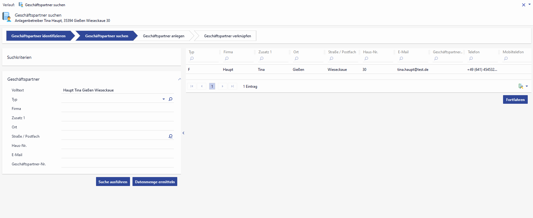 Abb. 1 - Geschäftspartnersuche - Für die eingegebenen Suchkriterien wurde ein Datensatz gefunden