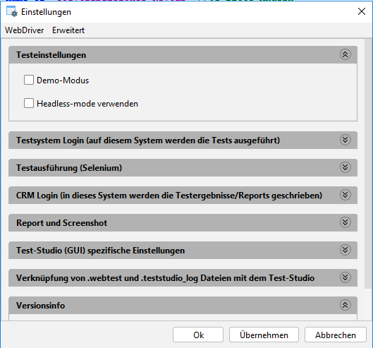 Wichtige Einstellungen zur Testerstellung und Ausführung werden direkt im Test-Studio unter Einstellungen konfiguriert: