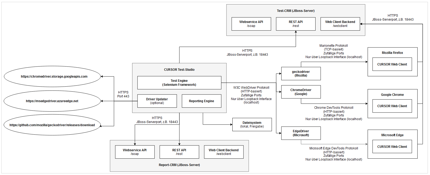 Technischer Kommunikationsplan der CURSOR-Test-Studio Komponenten