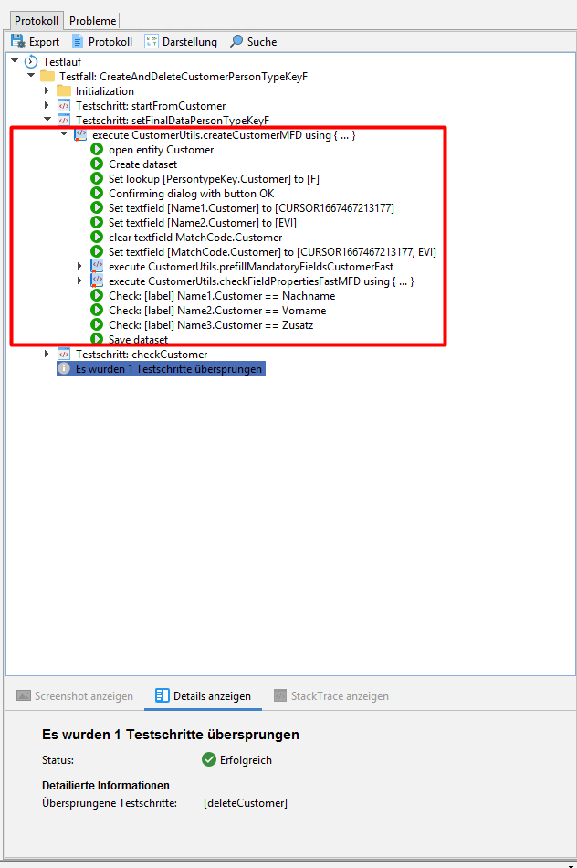 Dem Protokoll kann entnommen werden, wann eine Testschrittmethode aufgerufen wurde → execute Bibliotheksname.Testschrittmethode