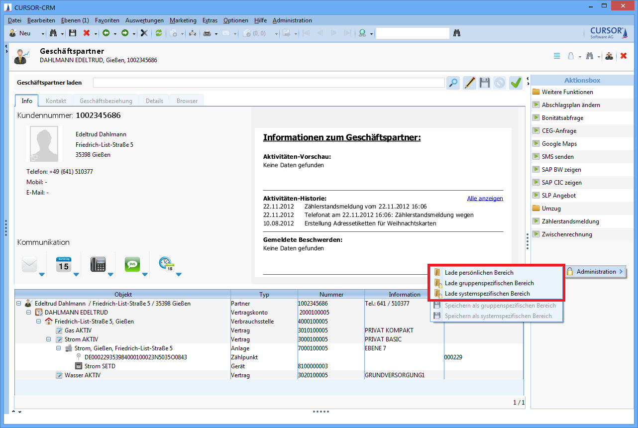 Once you have created actions, save the action box by right clicking - Administration - Save as xxx-specific area as a desired configuration. Select the group-specific range if you want the change to only apply to a specific user group. If the logged in user has a group-specific configuration for the user group, then this configuration will be loaded and the system-specific configuration will be ignored.
