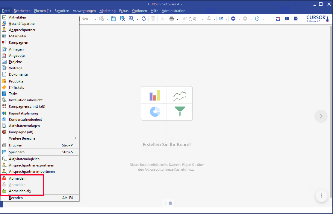 If you want to log in as another user on the same machine (e.g. as administrator on a user computer to solve a problem or to change settings), then you can do so via the main menu File / AbmeldenLogout and Login.