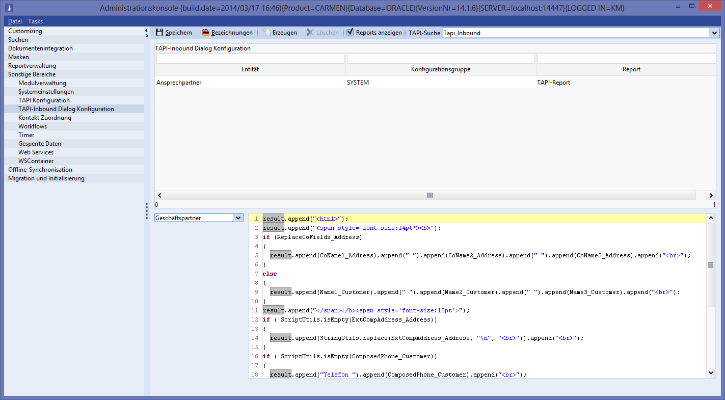 The new TAPI search can be selected in the TAPI inbound dialog configuration. When saving, the text scripts are checked for the fields used.