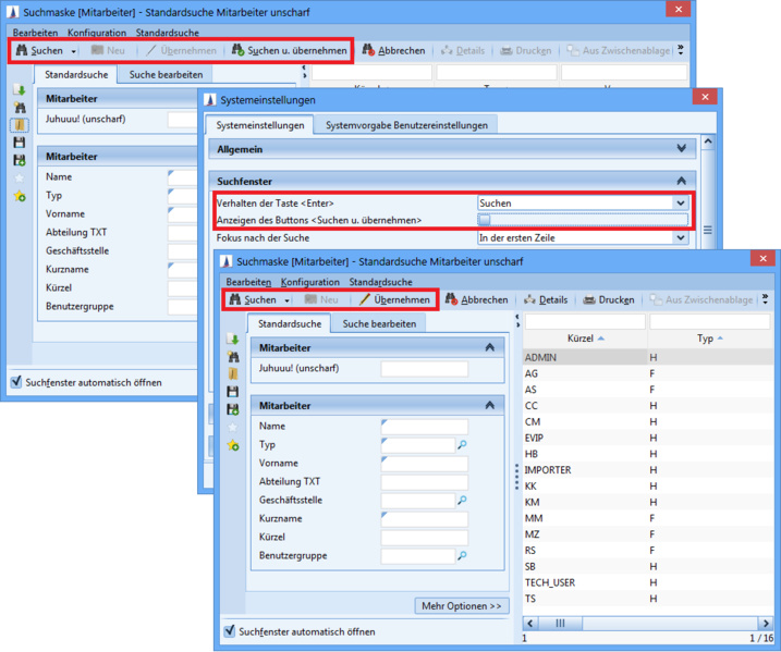 The only exception: Double-clicking or clicking ENTER in the search results list displays the selected entry in the detail mask.The button Search and adopt