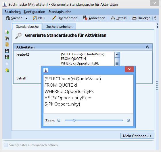 Extended toolbar | The Save SQL and Save XML buttons can be shown or hidden in the options area via the selection box Extended toolbar. The default value is switched off. The purpose is to simplify the search mask. Rarely used functionalities should be moved to the background. |