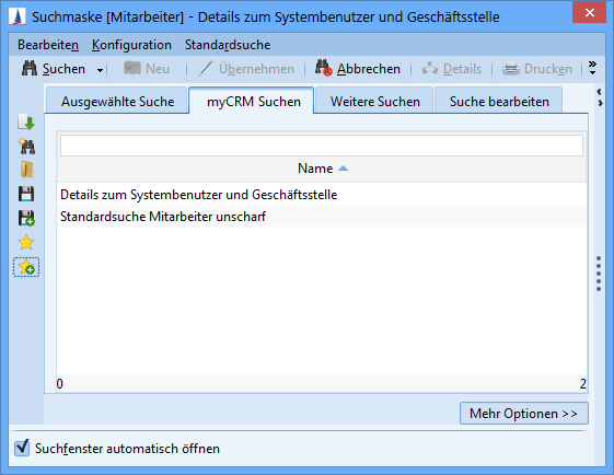 The list of all searches of the current user that are stored in their myCRM area is displayed. The display name from myCRM is shown.