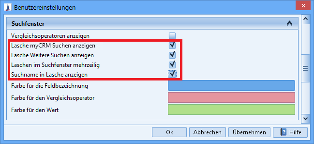 Saves changes to the search with its individual selection criteria in myCRM | If a search is loaded via the myCRM area, the button for saving or updating the search in myCRM is available. This means that changes can be saved directly in the same myCRM search entry. It is no longer necessary to manually delete the old entry and rename the new entry. The button is inactive if the search was not loaded from the myCRM area. |