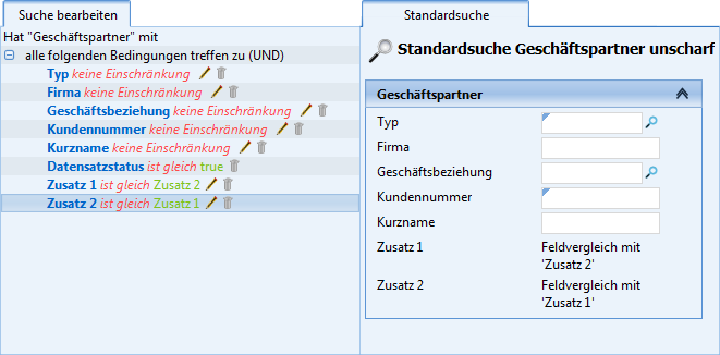 The 'CompareTemplate' template exists for the 'is equal to ' and 'is not equal to' function, with which two fields from the search with the same data type can be compared. The template is complementary, i.e. the template must be used with a reciprocal reference in the conditions of both fields.