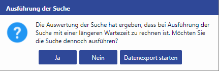 Checking the execution costs | Before executing searches, the system estimates the execution costs. If, for example, a search is insufficiently restricted on larger amounts of data, the following message appears so that the system is not unnecessarily burdened with long-running searches. ![]() In search editing, the execution cost check can be disabled and saved for the current search. Administration The threshold value for the execution cost check can be configured by the administrator in the application parameters.