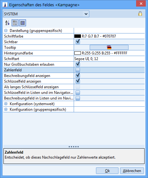 Search field | If this field is marked, the search field will be filled in default searches for the entity and can be used to restrict the search. To fill the standard search dialog from an independently created entity with fields, the corresponding fields must have the search field attribute. When processing a search, all fields from the search can be added as a condition independent of whether or not this field is marked. |