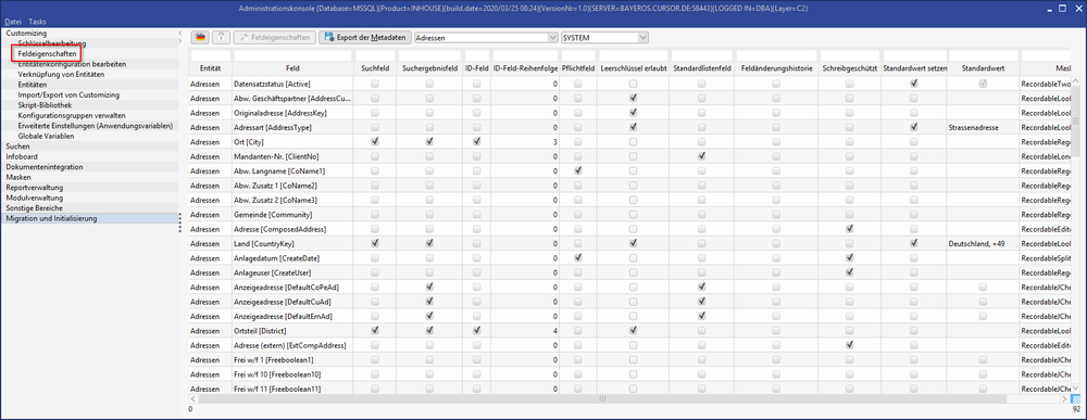 In the administration console, the graphic interface for the field attributes where settings can be made is located in the Customizing node. You will see a list with all fields for all entities. The number of listed fields can be controlled via the filter function in the header. When editing the properties, it makes sense to filter the respective entity and to undertake further restrictions to improve the overview.