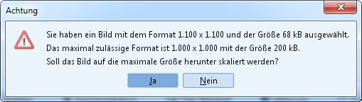 The image is scaled by clicking on Yes so that the format and file size are not exceeded. The image is not inserted with a click on No.