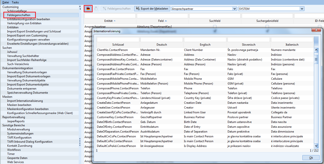 Tooltip | You can reach the internationalization dialog via the button next to it. In this dialog, the tooltip text can be entered for multiple languages for the currently selected field or text. The new “tooltip” field attribute including the internationalization will be considered during the import/export of the customizing.