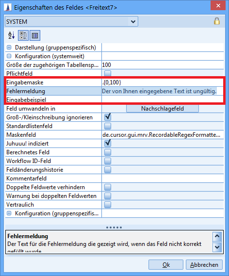 Input mask error message | Customized descriptions that should correlate with the input mask and the input example (see input example) can be included in the error message for the field. |