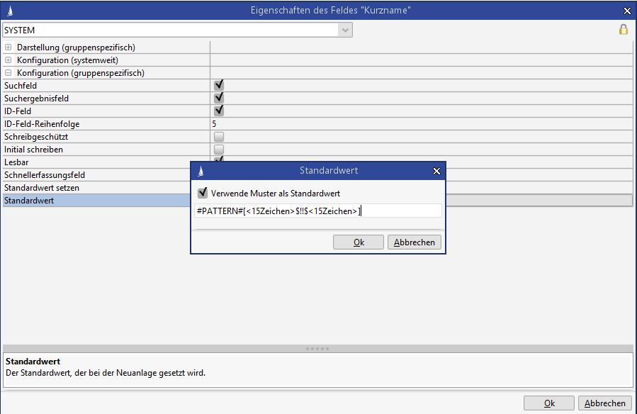 Deactivating the “Set default value” flag does not result in the automatic emptying of the “default value” field. Using the dialog for configuring the default values, the problem with a limited number of font properties in a field can be bypassed. Example: if a maximum of 10 font properties is allowed for a field, you can use a pattern that exceeds 10 characters. Formal: A pattern is the string 'Pattern' and not the whole expression. In that case:
