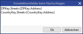 Lookup Preselection Fields | Configuration of the search restrictions used for preselection and the proposal list. Each configuration is stored in a new row. ![]() In a syntax with In the example a function is specified optionally, with which the given value is checked. If no function is specified, NONE is used. The standard function is then automatically used when looking up or validating (user preferences). The following functions are possible: