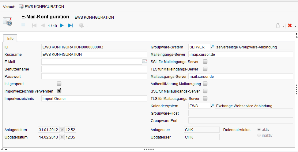 The email address that receives and imports the emails must be saved as a mail configuration in the CURSOR-CRM/EVI. The match code for the mail configuration must be BCCIMPORTER, because the workflow searches for this mail configuration.