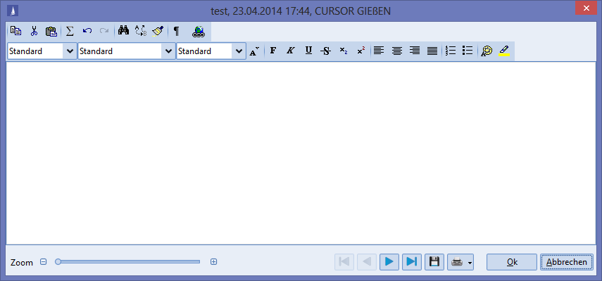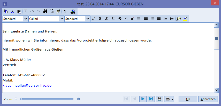 The HTML editor is an external component of a third-party provider that can be used within CURSOR-CRM/EVI/TINA specifically for the activity text. As a result, CURSOR Software AG is dependent on the scope of services and support of the third party provider.