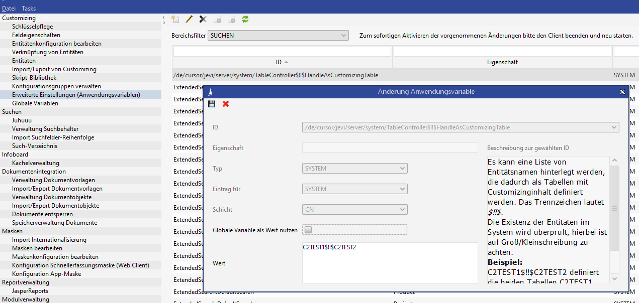In this entry additional tables can be stored. These tables are evaluated as tables with the content type Content: Customizing.If the data quantity is very large, the entry with the id = ‘/de/cursor/jevi/server/business/businesslogic/TransactionWrapper$!!$TimeOutCleanTables’/de/cursor/jevi/server/business/businesslogic/TransactionWrapper$!!$TimeOutCleanTables’ must be checked or adjusted in the PropertyMapper.