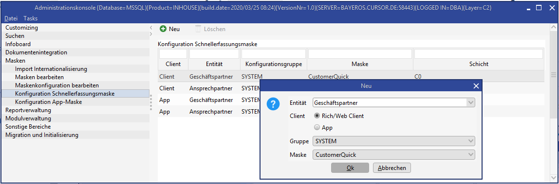 A quick entry mask must be configured before it can be used. Which quick entry mask will be show for a specific combination of entity and configuration group must be configured in the node. The quick entry mask used can be changed later. The entry for the configuration group SYSTEM cannot be deleted. The entries for all other configuration groups can be deleted.