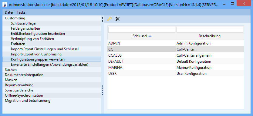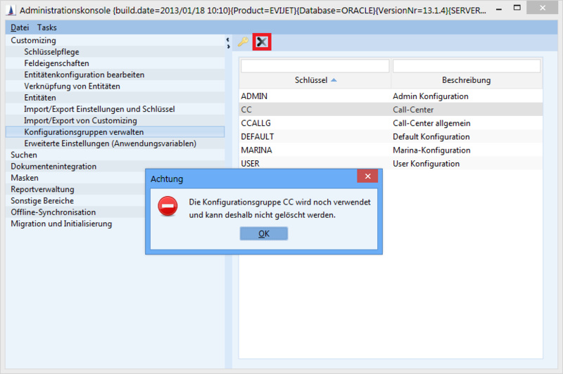 A configuration group can be deleted via the admin console (Customizing / Manage configuration groups). If the configuration group is still entered for an employee, a message will be displayed that the group cannot be deleted.