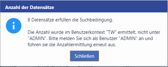 When checking the number of datasets for a deletion rule in another user context, a separate message is displayed