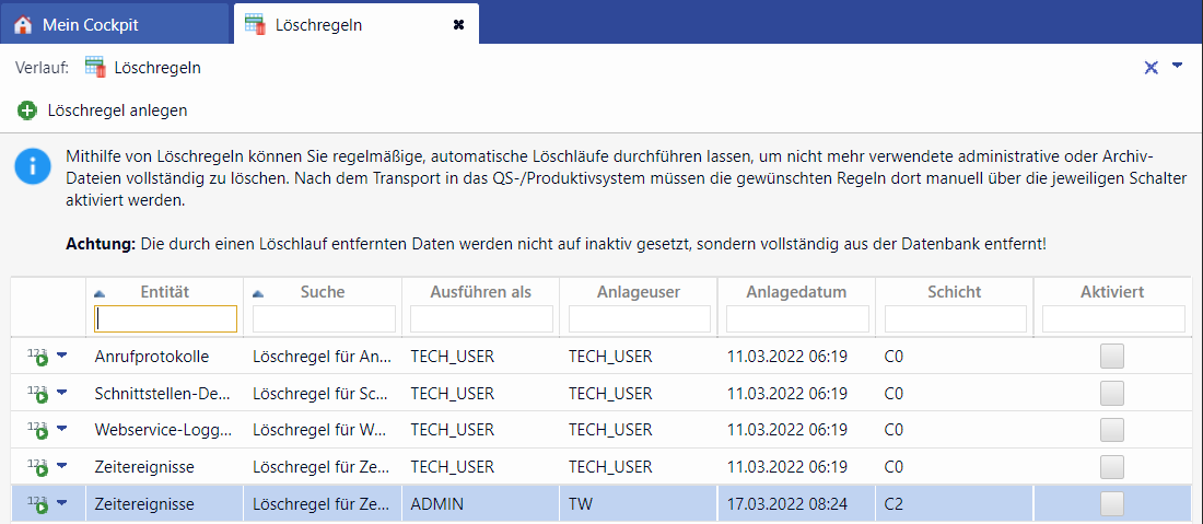 The deletion rule is now executed in the context of a user, thus applying their unit and group rights to the data. Requirement for customizing in customer systems: Employee synchronization is activated or a technical employee has sufficient rights.