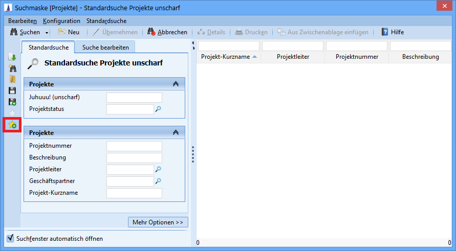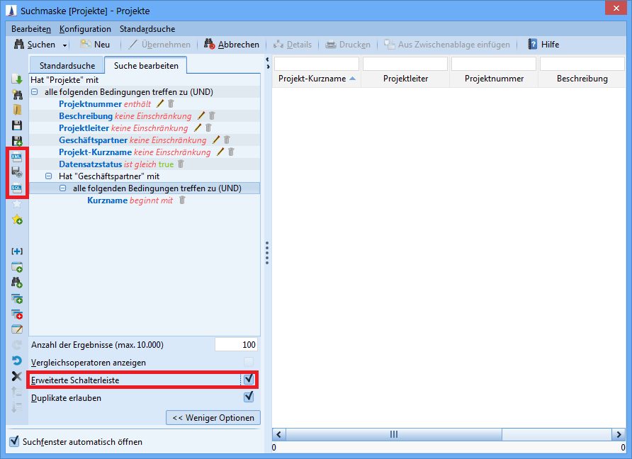 The symbols for editing the search can be found in the lower area of the toolbar. The order of the standard symbols (loading the default search, new search, save, etc.) are also adjusted.