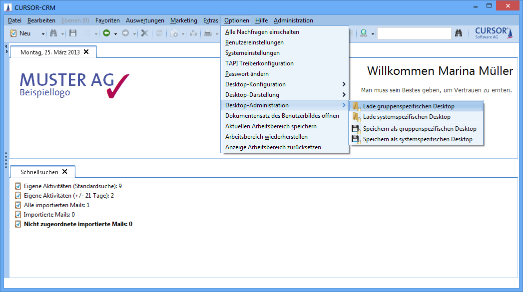 The objective of the add-on is to facilitate desktop configurations directly from within the application. The definition is applied system-wide, configuration group-specific and user-specific. Diagrams, reports, RSS-feeds, quicksearches and the welcome slogan are saved.