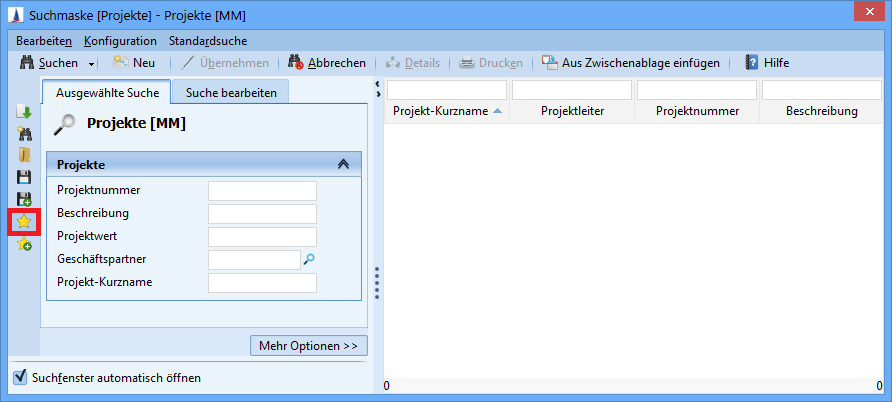 Searches and favorites are supported. Other types, such as reports, can be saved in the autostart folder. However, these are not considered when the application is started. At most one search should be saved. Any number of entries are possible for favorites.