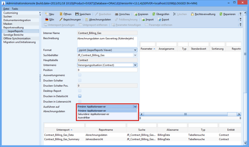 In order that a report can be swapped out on the mass data server at all, its settings must be changed in the JasperReports node in the Administration Console. The administrator can control the execution of the report using the 'Execute on' option. There are three different options: