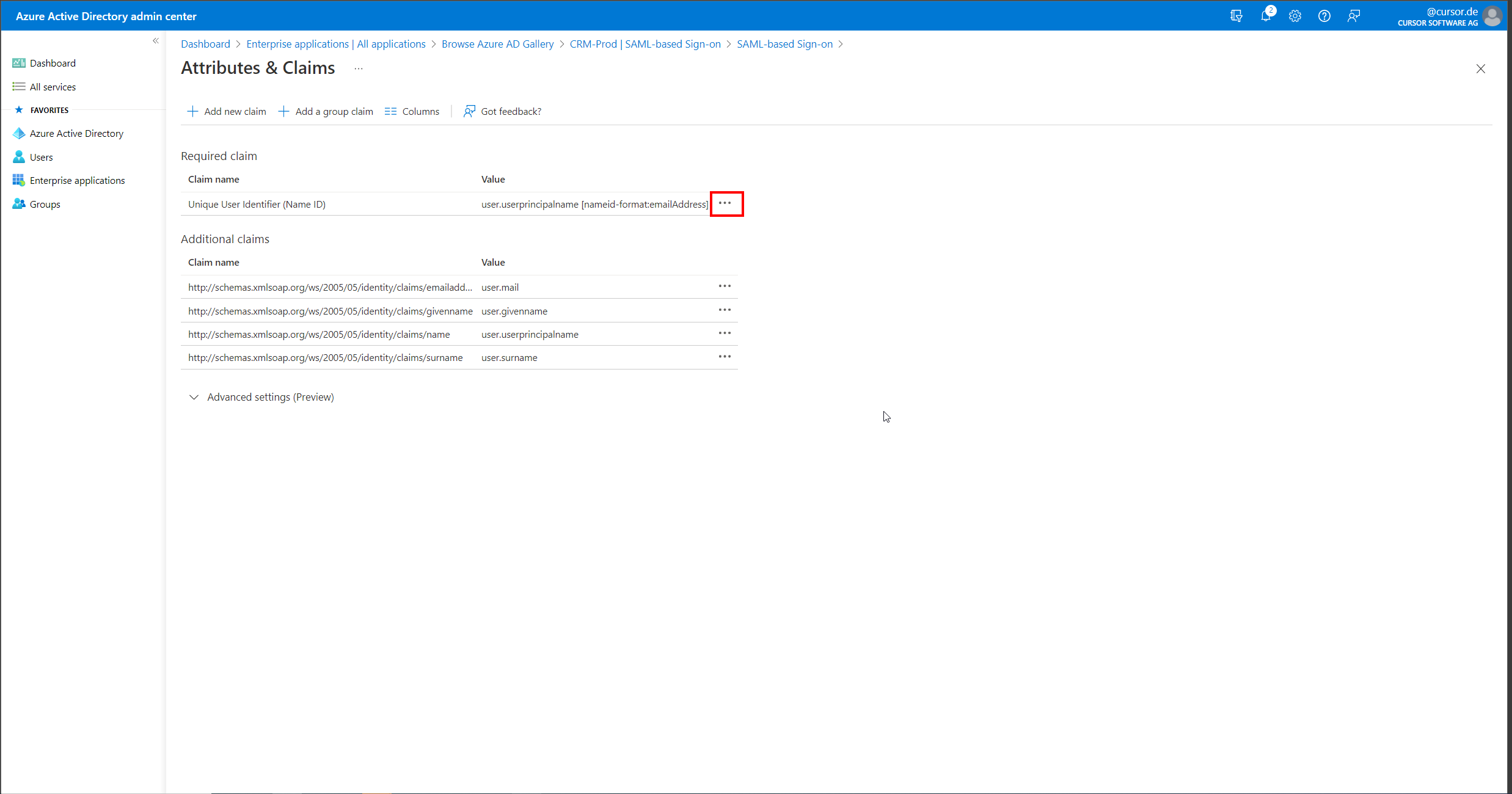 After performing these steps, the configuration of Azure AD for using SAML 2.0 with CURSOR-CRM is completed. The next steps should now also be to configure the CRM system to use SAML in the system settings. Also, in the employee datasets, the "SAML Login Name" field (SAMLLoginName.Employee) must be set to exactly match the Name IDs sent from Azure AD so that user mapping can be performed.